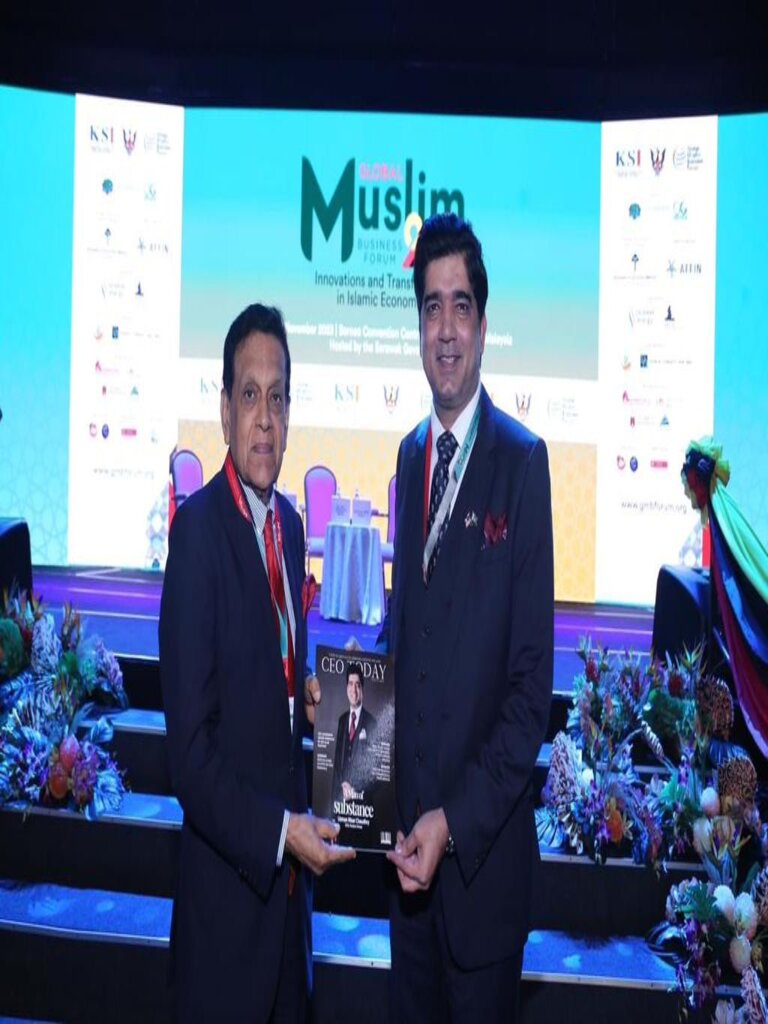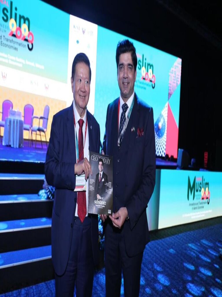 Chaudhry Usman Nisar Chairman (Panjtan Group) & Co-Chairman (Global Muslim Business Forum GMBF) presented CEO Today (Pakistan) Magazine to Tan Sri Micheal Yeoh President KSI and Chairman Global Muslim Business Form at GMBF event at Kuching (Sarawak)